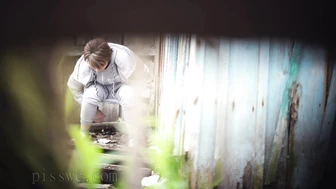 Cooles Video einer anderen Frau, die sich entschließt, hinter einem verlassenen Gebäude zu pinkeln, aber das Wackeln der Kamera durch den Kameramann ist ein wenig störend. Nachdem sie gepinkelt hat, passt sie ihre Hose an und steht mit dem Bauch zur Kamera, und wir können ihre Muschi durch ihre graue Leggings sehen.